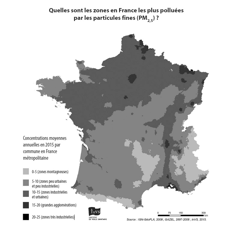 Elle s’est appuyée sur les données de surveillance de la qualité de l’air obtenues par les associations agréées, les Aasqa. Comme l’on peut s’y attendre, les grandes agglomérations, comme la région parisienne et l’axe Lyon-Marseille, enregistrent des taux élevés en PM2,5, issus surtout du trafic routier. Mais il serait faux de croire que les zones moins urbaines sont épargnées : l’Étang de Berre (dans les Bouches-du-Rhône), l’Est de la France, la Normandie subissent la forte présence industrielle. Pour respirer un bon bol d’air toute l’année, mieux vaut vivre loin des grandes villes, sur le littoral ou mieux en montagne : en Auvergne, dans les Pyrénées et les Alpes, la densité de population est faible et donc le niveau de PM2,5 aussi. Toutefois, n’oublions pas qu’il demeure des exceptions comme la vallée de l’Arve, au pied du mont Blanc, très polluée en PM2,5 l’hiver à cause du chauffage au bois mais aussi du trafic intense des camions qui montent vers le tunnel du mont Blanc.