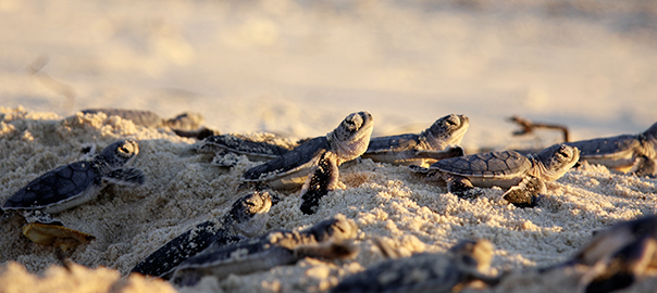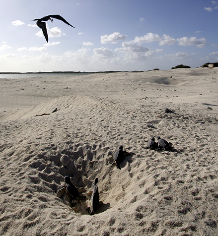 Sur une ponte, seul un bébé tortue en moyenne parviendra à l’âge de se reproduire à son tour pour perpétuer l’espèce…, voire un bébé sur une dizaine de pontes, sur les sites où la prédation des nouveau-nés par les oiseaux marins ou les poissons carnassiers est extrême. Sur certaines plages, seules les tortues qui émergent du sable durant la nuit ont une chance de rejoindre l’océan. Les tortues qui tentent de parcourir la plage de jour n’ont aucune chance de survivre aux assauts répétés des frégates et autres oiseaux prédateurs, qui déciment la fratrie en quelques minutes.
