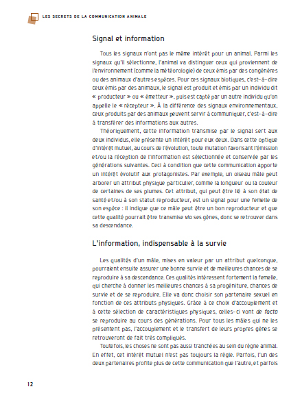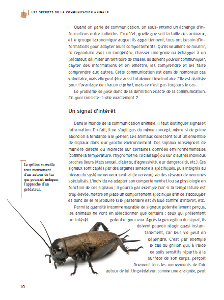 Connaissez-vous le langage des couleurs, employé par de nombreuses espèces pour séduire ou repousser ? Ce livre vous parlera également de stratégies, la communication animale n’étant pas exempte de tromperies, comme les flashs lumineux envoyés par des lucioles femelles pour dévorer des mâles d’espèces proches, ou émis par des poissons abyssaux pour capturer des proies. Richement illustré, cet ouvrage fait l’éclatante démonstration que l’échange d’informations complexes n’est pas le propre de l’humain.
